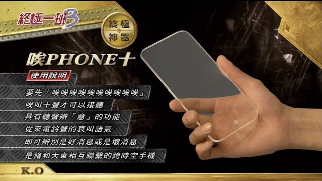 【唉PHONE十:要先[唉唉唉唉唉唉唉唉唉唉]唉叫十声才可以接听,具有听声辨意的功能。从来电铃声的哀叫语气即可辨别是好消息或是坏消息,是修和大东相互联络的跨时空手机。】