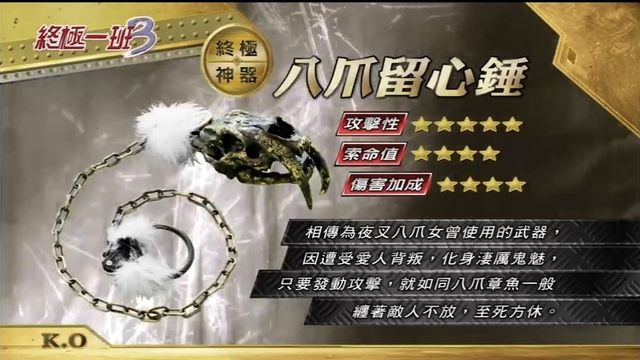 【八爪留心锤:相传为夜叉八爪女曾使用的武器,因遭受爱人背叛,化身凄厉鬼魅,只要发动攻击,就如同八爪章鱼一般缠着敌人不放,至死方休。】