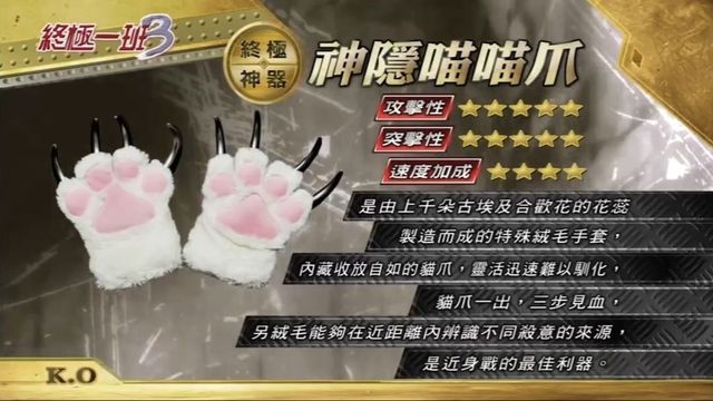 【神隐喵喵爪:是由上千朵古埃及合欢花的花蕊制造而成的特殊械毛手套,内藏收放自如的猫爪,灵活迅速,难以驯化,猫爪一出,三步见血。另绒毛能够在近距离内辨认出不同杀意的来源,是近身战斗的绝佳利器。