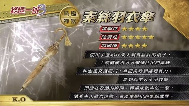 【素丝羽衣伞:使用了蓬帕杜夫人亲自设计的梭子,上端缠绕洛可可蜘蛛吐出的素丝,和金线交织而成。伞面柔软却强韧有力,能够为主人承受攻击。即能在收起的瞬间,转换成致命的一击,随着主人战力进阶,会产生变化的鬼魅武器。】