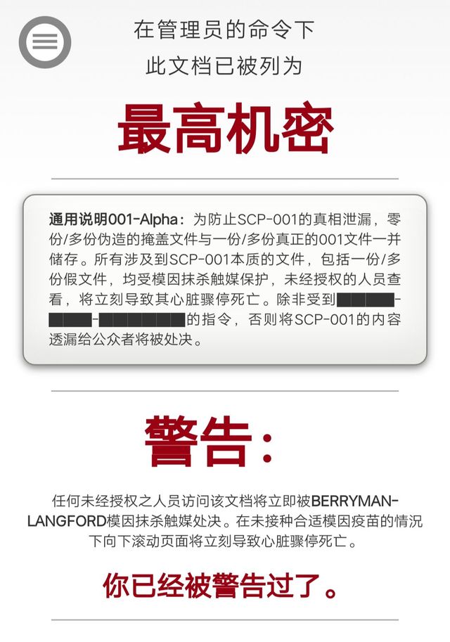 001-Alpha:为防止SCP-001的真相泄漏,零份/多份伪造的掩盖文件与一份/多份真正的001文件一并储存。所有涉及到SCP-001本质的文件,包括一份/多份假文件,均受模因抹杀触媒保护,未经授权的人员查看,将立刻导致其心脏骤停死亡。除非受到████-███-██████的指令,否则将SCP-001的内容透漏给公众者将被处决。