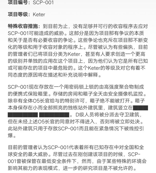 特殊收容措施:到目前为止,没有足够并可行的收容程序去应对SCP-001可能造成的威胁。这部分是因为项目那有争议的本质和关于是否有必要收容的争论。这些争论也充斥在项目那不断变化的等级和用于收容对象的程序上。尽管被认为有些偏执,目前的管理者们已将项目分类为Keter,甚至有人要求创造一个更高的级别并单独的应用在这个项目上,因为他们认为它是所有已知或可能存在的项目中最危险的。这个Keter的等级及对它有着不同态度的原因将在描述和补充说明中解释。