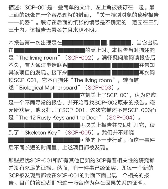 描述:SCP-001是一叠简单的文件,左上角被装订在一起。最上面的纸张是一个容易理解的封面,“关于特别对象的秘密报告——机密”。装订在后面的纸张的编号是不确定的,范围在三到三十内。该报告无署名并且来源不明。