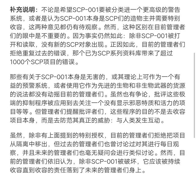 补充说明:不论是希望SCP-001要被分类进一个更高级的警告系统,或者是认为SCP-001本身是SCP们的造物主并需要特别收容,这两种意见都仍有待观察。然而,这种区别在目前管理者们的眼中是不重要的。因为事实仍然如此:除非SCP-001被打开和读取,没有新的SCP对象出现。正因如此,目前的管理者们拒绝重复过去的错误,那个已为SCP系列资料库带来了超过1000个SCP项目的错误。