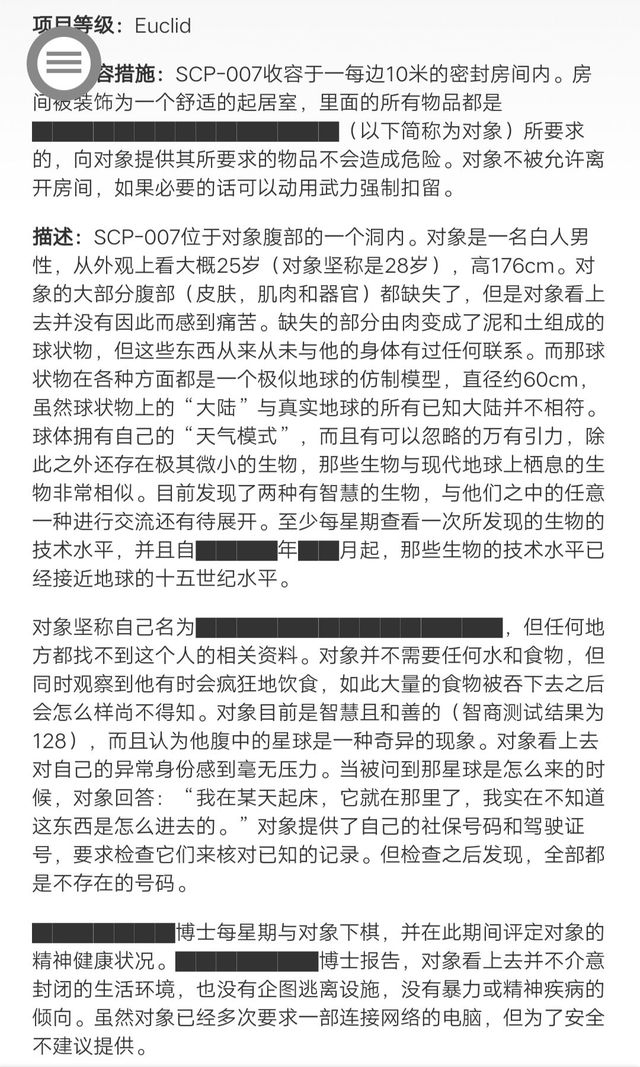 描述:SCP-007位于对象腹部的一个洞内。对象是一名白人男性,从外观上看大概25岁(对象坚称是28岁),高176cm。对象的大部分腹部(皮肤,肌肉和器官)都缺失了,但是对象看上去并没有因此而感到痛苦。缺失的部分由肉变成了泥和土组成的球状物,但这些东西从来从未与他的身体有过任何联系。而那球状物在各种方面都是一个极似地球的仿制模型,直径约60cm,虽然球状物上的“大陆”与真实地球的所有已知大陆并不相符。球体拥有自己的“天气模式”,而且有可以忽略的万有引力,除此之外还存在极其微小的生物,那些生物与现代地球上栖息的生物非常相似。目前发现了两种有智慧的生物,与他们之中的任意一种进行交流还有待展开。至少每星期查看一次所发现的生物的技术水平,并且自████年██月起,那些生物的技术水平已经接近地球的十五世纪水平。