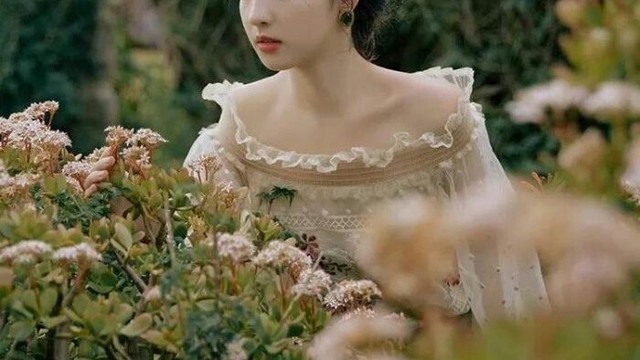 一位身着精致装束的女士静立于花园中央,穿着浅色连衣裙她精心梳理的发髻高高盘起,点缀其间的是一对耳饰,在阳光下闪烁,为她平添了几分古典韵味,她正修剪着眼前的花朵