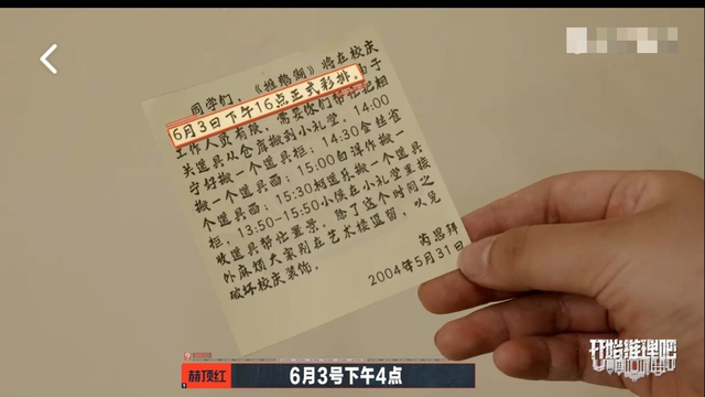 〈赫顶红在礼堂的一个角落里的墙壁上,无意间发现了一张被风轻轻吹拂的便利贴,这张便利贴是导演精心贴在墙上的,上面密密麻麻地记录着给即将上台表演的演员们的任务〉