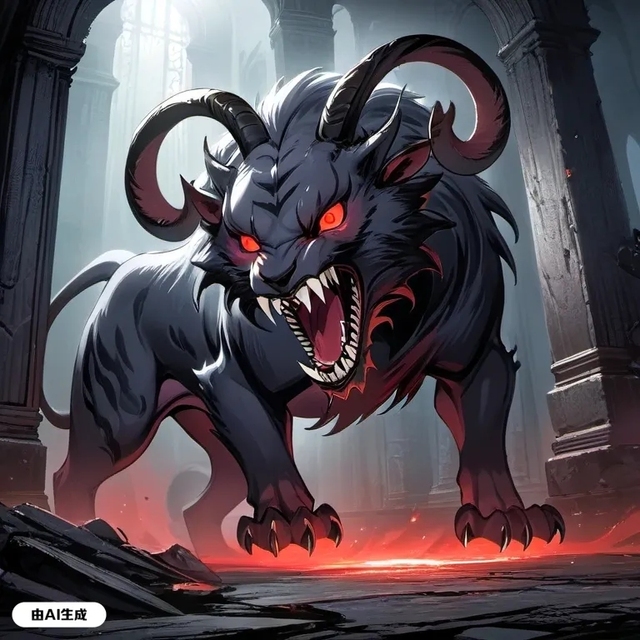 它是一个长着羊角的巨型虎形生物,它,张开血盆大口,似乎要吃掉眼前的卡利亚。