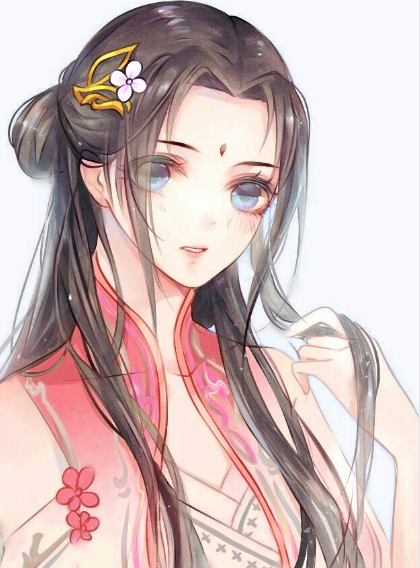 她身着一袭粉色华服,其上绘有红色的图案,衣物的质地柔软,褶皱间仿佛能听到丝绸的咒语,粉色与蓝色的光影交织。