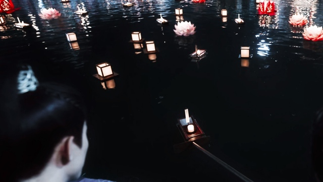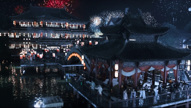 一轮盈盈皓月,如同明珠镶嵌在那深邃如梦的天幕,璀璨的烟花绽于天际,灯火阑珊处,点点光晕仿佛银河洒落人间,而那一盏盏祈愿的花灯,静静漂浮在波光里,犹如一条曳着银辉的锦带绵延。