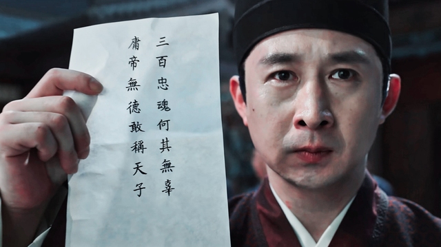 黄仁利抬手扬起纸张,只见上面赫然写着“三百忠魂何其无辜,庸帝无德敢称天子”几个大字。
