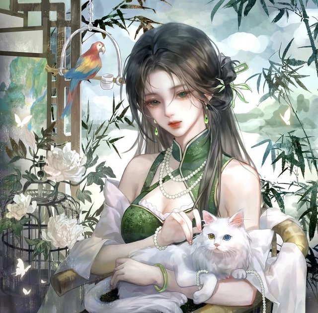 在宁静的殿堂深处,一位少女独坐在轮椅上抚摸着一只通体雪白的猫。她长发如墨,披散在双肩,散发着淡淡的清香。穿着青绿色的长裙,裙摆轻轻飘动,勾勒出她修长的身姿。那双洁白的长腿,若隐若现地展现出她的优雅和娇美,也许是因为双腿的问题,她透露出一丝忧伤的气息。