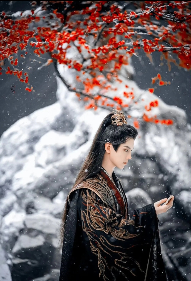那是在一个漫天飞雪的雪境里,一棵盛开的红梅树下,独自站立眺望远方的身影。
