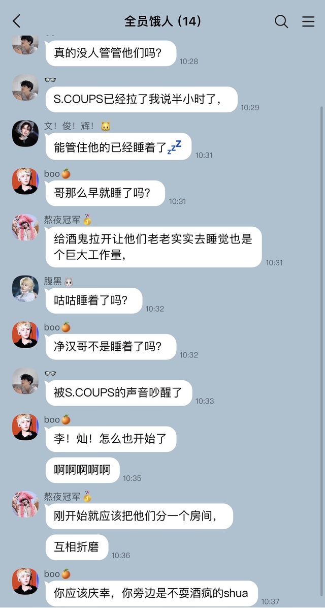 尹净汉有点动静就睡不好,最后只能和文俊辉发个消息,自己拿着枕头去投靠绿卡line,