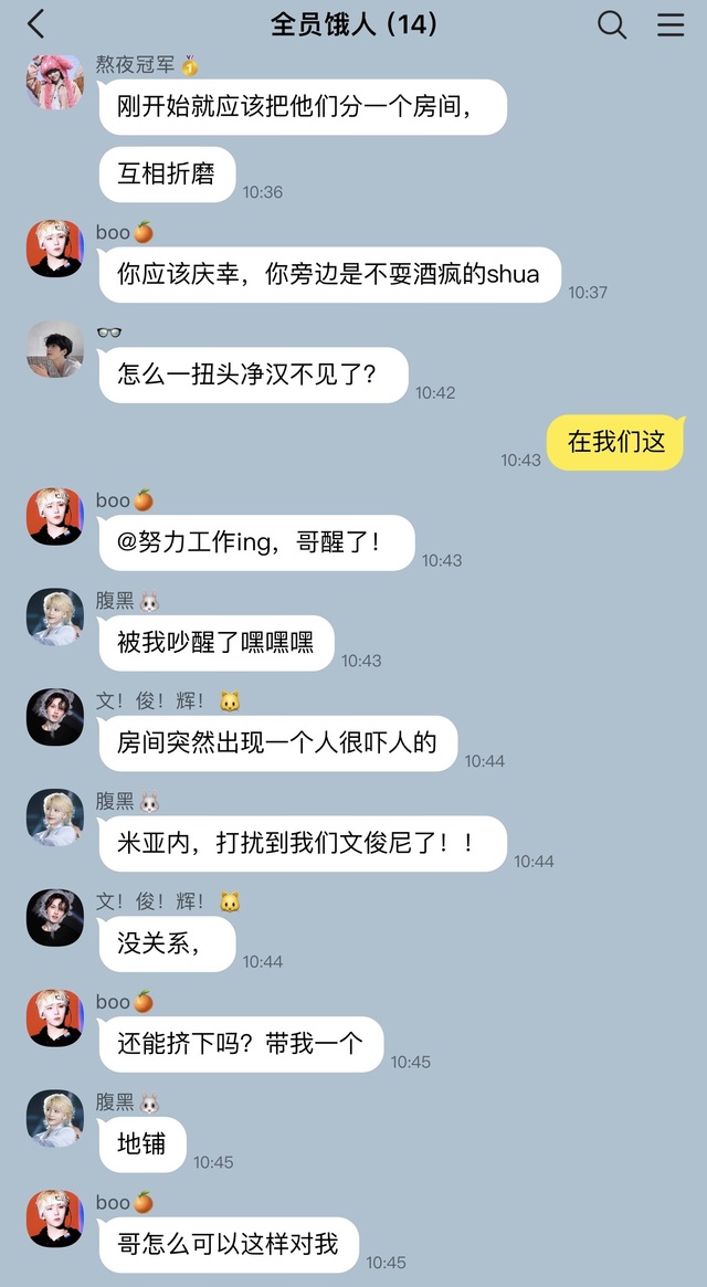 先是把自己房间的三个喊醒,后面就到了混乱的地方了,看着在地毯上盖着被子的李灿他真的快被笑死了,