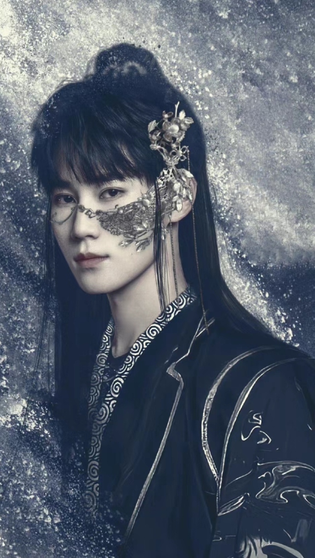 男子脸上还带着一条银链,链子两边挂在耳朵上,左脸的链子垂下一片镂空雕刻的部分