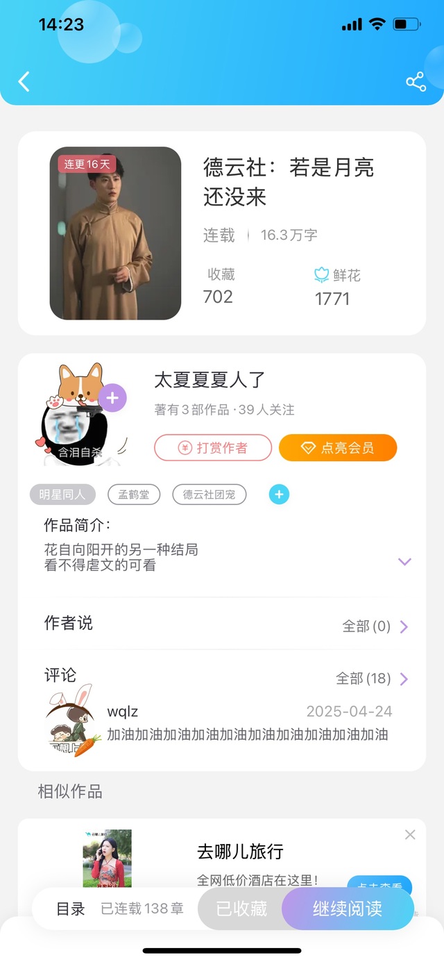 接下来故事不会停,【如是月亮还没来】孟澄澄故事还会以另一只方式延续,我会保持日更。或许有了第一篇不成熟的想法,第二篇就很顺利了,目前还在更新中……