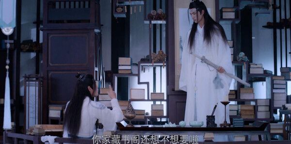 那日,魏无羡终于完成了漫长的家规抄写,他难得乖巧地站在蓝忘机面前,手中还挥舞着一幅蓝忘机的画像,鬓角处夸张地添上了一簇花朵。蓝忘机依旧冰雕玉琢,面无表情地斥责魏无羡无聊之举,随后,他随手拿起桌上的书籍——却未察觉,这书早已被魏无羡巧妙地换成了春宫图。