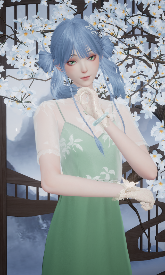 落下的春杏花瓣恍若在她晶蓝的发间抽支生长,于她身着的青衫上绽放。