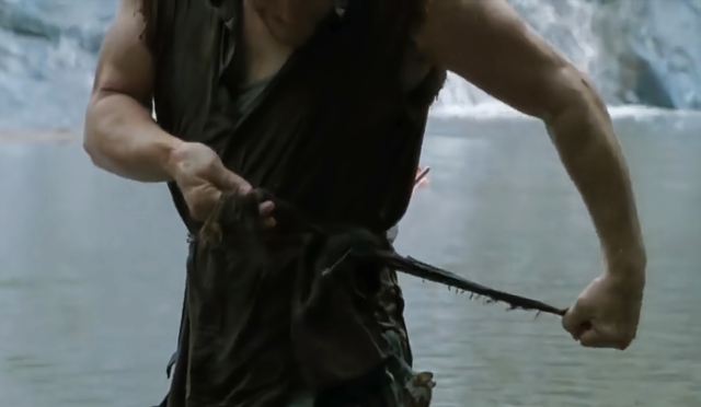 达里尔强忍着疼痛起身朝着河岸边走去,为了避免失血过多休克,达里尔扯下自己的衣服将伤口紧紧勒住。
