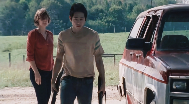 赫谢尔从车上下来,玛姬激动地跑过去,赫谢尔正准备迎接玛姬,没想到她跑到了自己身后抱住了格伦,这就很尴尬了。