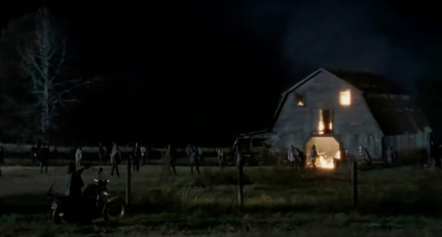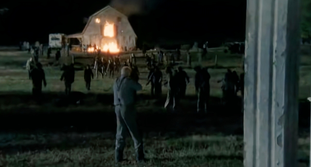 达里尔拿出手枪尽可能的解决往谷仓门口涌进的行尸,希望给你减少一点危险。