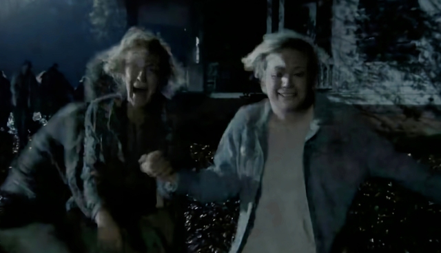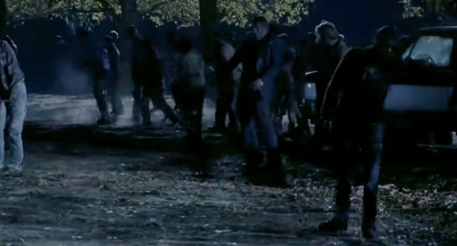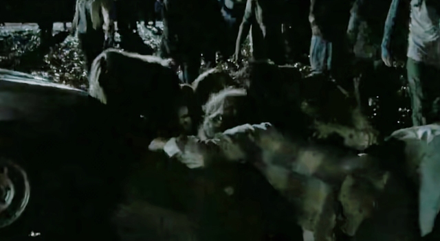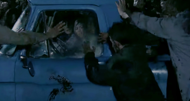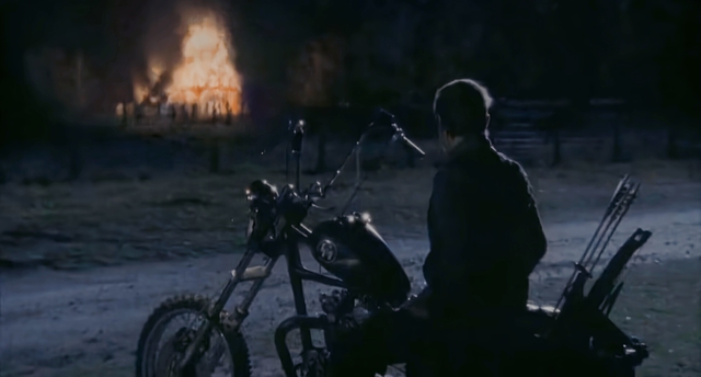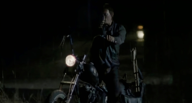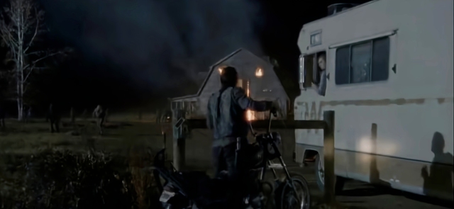 卡罗尔赶紧坐上达里尔的后座,达里尔骑着摩托车脱离了行尸的围攻。