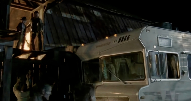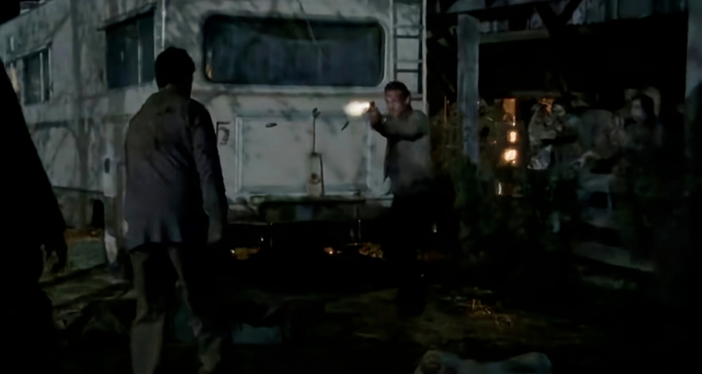 你们顺着房车的扶梯下去,瑞克赶紧掏出手枪射击着涌上来的行尸。