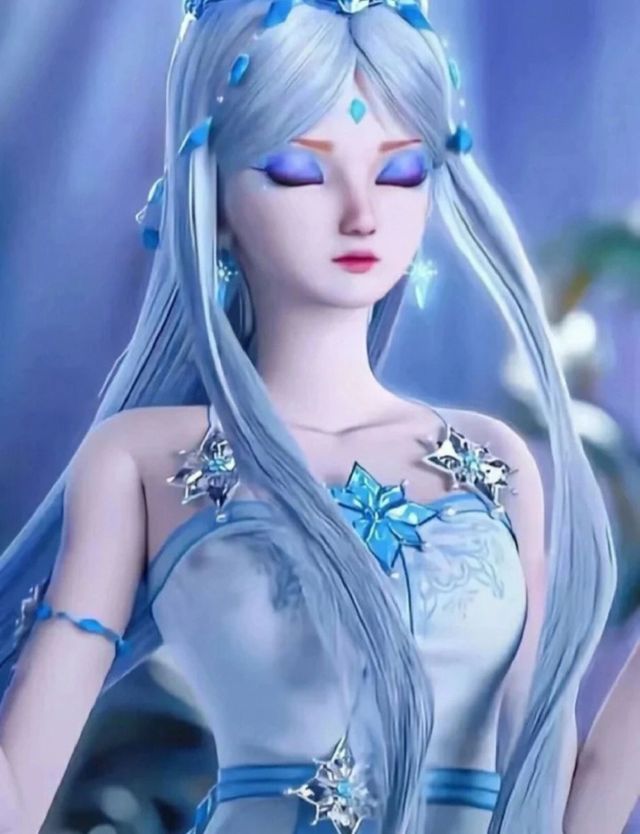 常年身着蓝色裹胸长裙,裙摆颜色由深至浅。花纹为错落有致的蓝白色雪花,腰间束着冰晶雪花垂链。