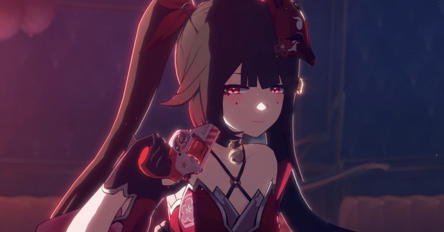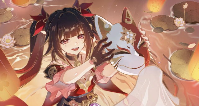 (一片神秘的暗影中,只闻其声未见其形,直到那枚做工精致的狐狸面具悄然浮现在虚无之中。紧接着,一道炽热的光芒逐渐凝聚,少女的身形在光影交错中徐徐显现,每一寸轮廓都如同火焰般灵动而热烈。她的出现,犹如一场盛大的烟火秀。)