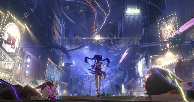 刹那间,黑影如梦幻泡影般爆裂,绽放成一场璀璨的烟火盛筵,五彩斑斓的彩带在空中曼舞,宛如织就了一幅流光溢彩的天幕。就在这一瞬的绚烂中,少女从中走出,她的出现点亮了整个夜空,令那一刻的美丽变得如此独特而动人。。