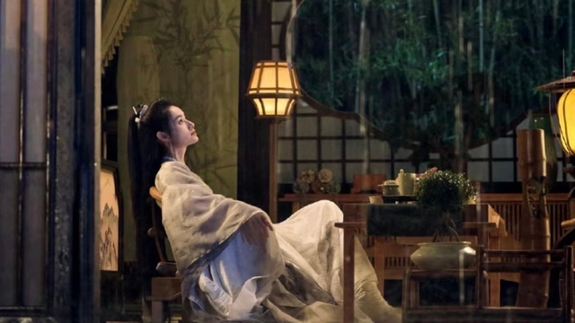 妤姮静坐在岸边,望着雨水点点坠入湖面,眼神透出难以掩饰的倦意。