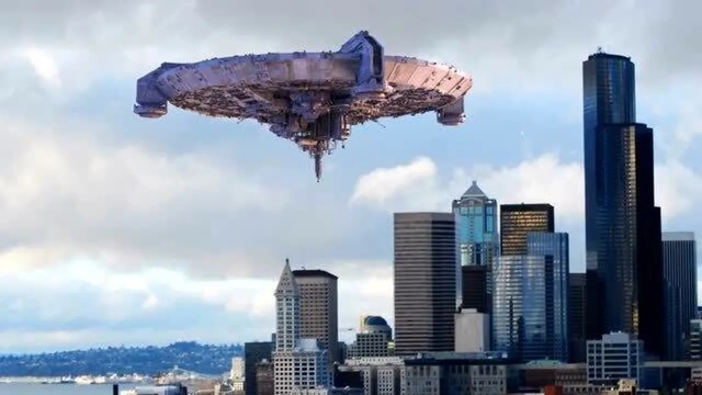一艘庞大的战舰迅速地降临于城市的天际之上(图片⬆),仿佛一座移动的钢铁堡垒,遮蔽了半边天空。紧接着,无数小型飞行器如蜂群般从母舰腹部蜂拥而出,它们在空中划出一道道银白色的轨迹,随即分散开来。这些小飞船四处穿梭,目标明确地对准了城市的建筑与人群发起猛烈的攻势,一时间火光冲天,烟尘滚滚。