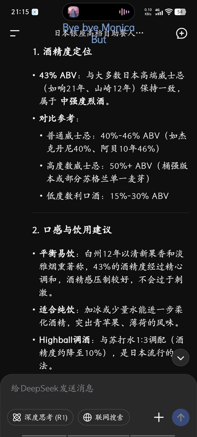 于是浅蝶隐跃跃欲试接过倒了一半威士忌的酒杯,小心翼翼喝了一口,几乎瞬间被白州12年的青苹果和薄荷味所俘获,满足地眯了眯眼。