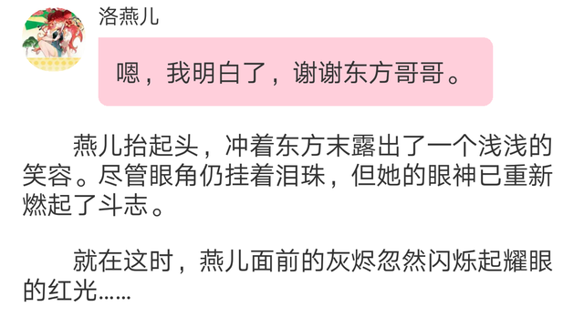 枫卫的声音再次插入,打断了两人之间的对话。她微微偏头,看向燕儿,嘴角勾起一抹淡淡的笑意,那神情中夹杂着鼓励与几分耐人寻味的意味。