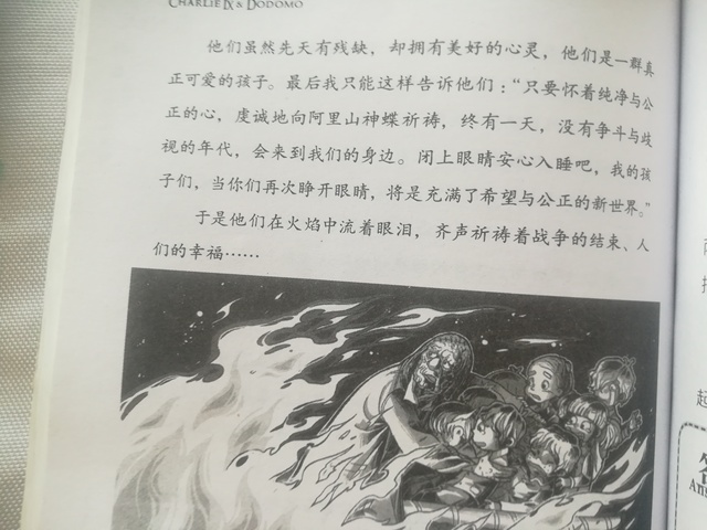 于是他们在烈火中流着泪,齐声祈祷着战争结束,人们幸福……
