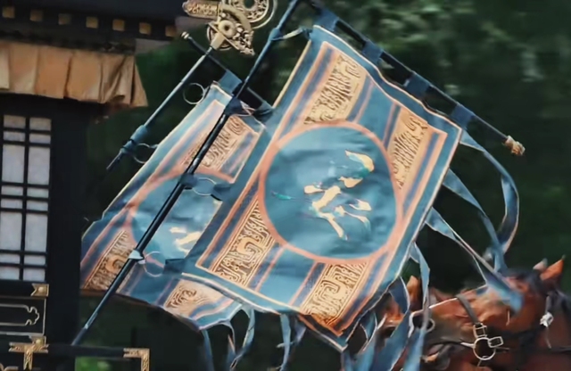 两旁簇拥着骑马的刀客护卫,气势磅礴,马车上插着绣有“晏”字的旗帜,彰显着主人的身份地位
