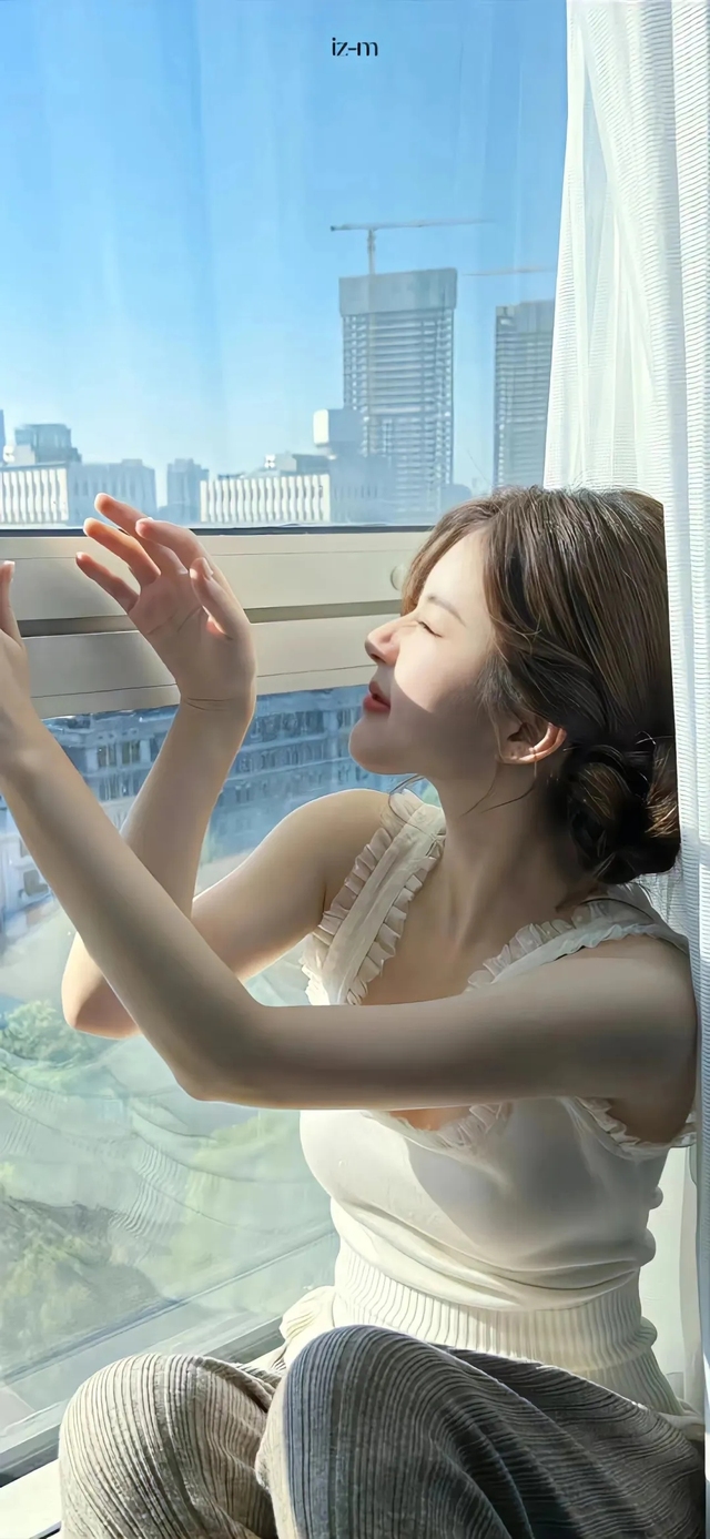 女孩蹲在落地窗上看风景,听到身后有叫声立马转身,原来是那只大金毛。