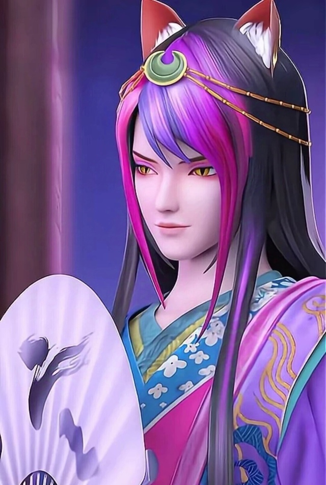 他的头发分为两部分,前为紫红交织的三七分刘海,发间缀着一块镶了金边的月牙状的玉,另还长有了一对同色系的紫色狐耳,其后则为黑色长发。