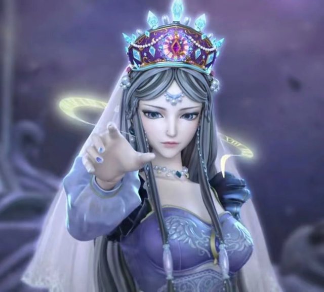 头戴镶有碧蓝宝石的紫色皇冠。