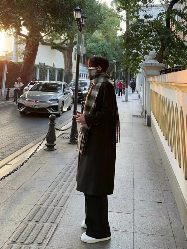 顾卿礼穿着黑色长款大衣,下身是一条黑色休闲裤,脖子上围着黑灰相间的围巾,眉眼弯弯的看着她。