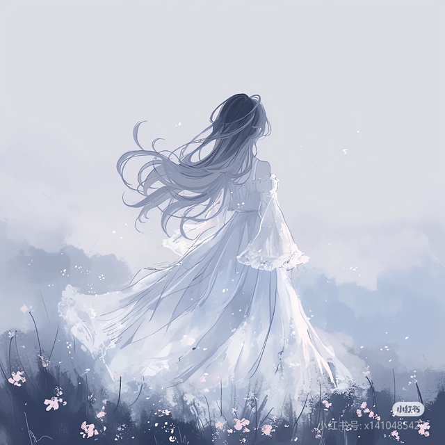 画中的女子身着一袭轻盈的白裙,裙摆随风轻轻荡漾,仿佛即将羽化升仙。青丝在清风中飘扬,如同挣脱枷锁的灵魂,自由地在空中飞舞,无声地诉说着未竟的故事。背景以淡雅的色调绘就,几朵含苞待放的小花悄然盛开,为空灵之景增添了几分生机与灵动。尽管女子只留下了一个背影,但她那曼妙的身姿却引人无限遐想——若她蓦然回首,定会露出一张明媚动人的笑靥。这般宁静而梦幻的氛围,无需言语,便已深深触动每一个观者的心弦,令人沉醉其中,不愿醒来。