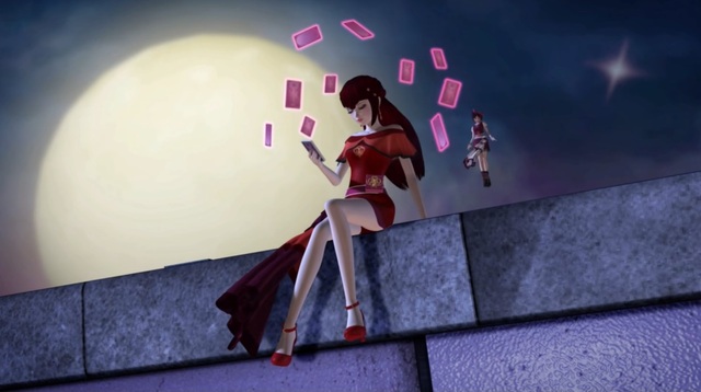 齐娜坐在一座建筑的屋顶,手里把玩着一副扑克牌。