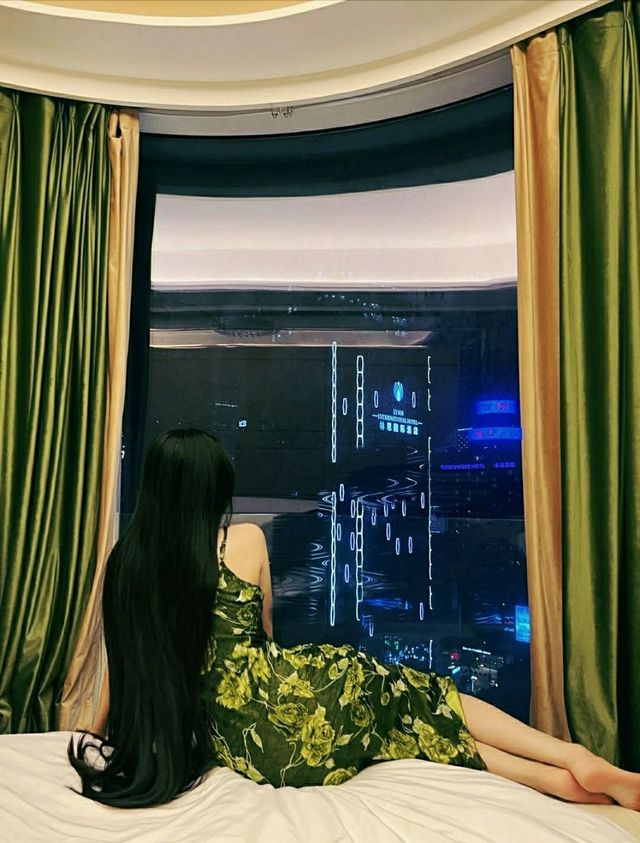 叶茗妃披着长发,穿着一条绿色的真丝长裙坐在舒服极了的床上欣赏着外面的夜景。
