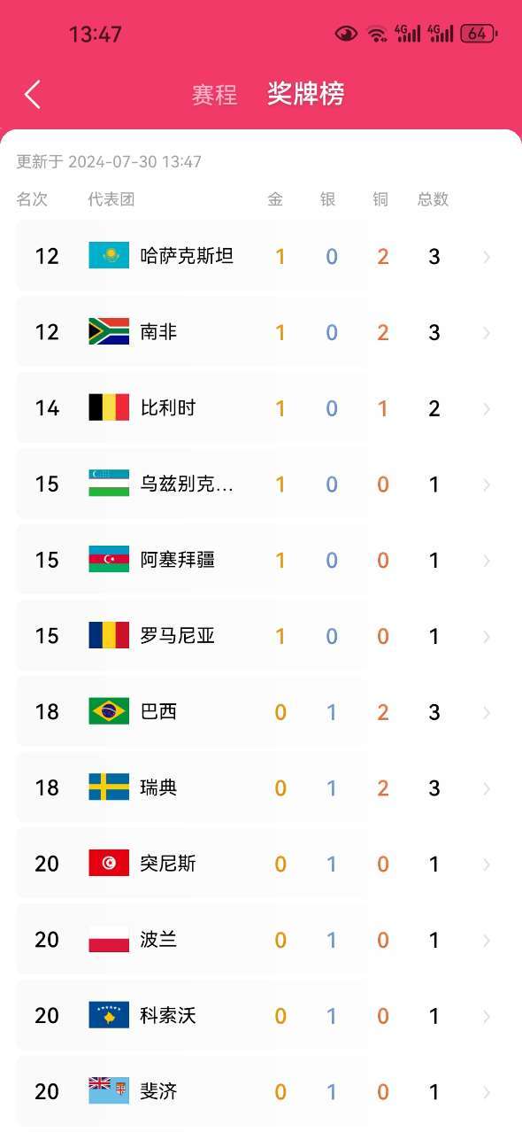到2024年7月30日,奥运会奖牌排名前十名。
