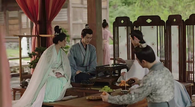 辰荣府中,清瑶、阿念和小夭坐在亭子里,三姐妹正闲聊着,忽然听到远处传来脚步声,转头一看,只见馨悦领着玱玹、涂山璟和丰隆走了过来。
