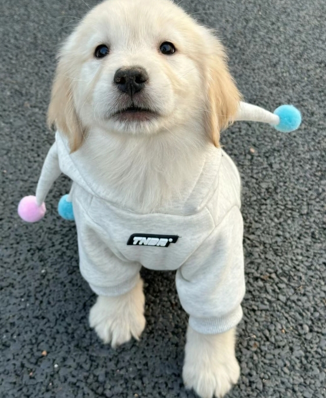 临走时那只愚蠢的金毛还不忘拽着自己的狗粮和狗碗