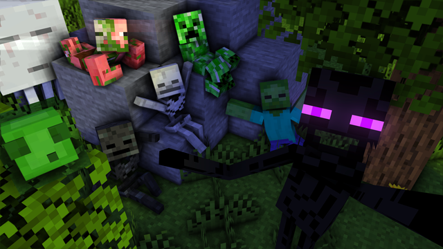 Enderman瞬移至Zombie旁边,将刚才Zombie从丛中跳出来时掉在地上的帽子重新轻扣在他的头上,顺便缓解一下气氛。