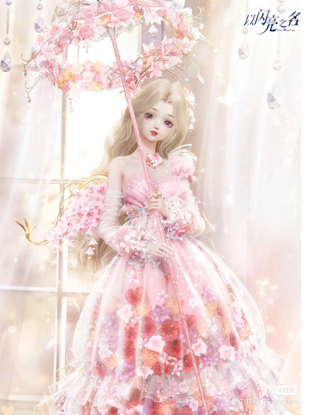 有着浅金黄色的卷发,白皙的皮肤,浅天蓝色的眼瞳,穿浅粉红色披肩,粉紫色衣服,桃粉红色高跟鞋,上面有白色装饰,头上有花环。