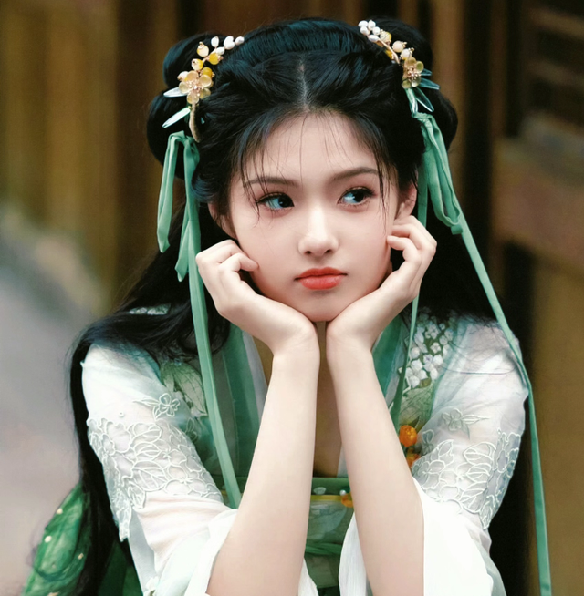 女生脑袋上带着配饰的浅绿头饰,还有一些绿色绒花做点缀,脑后的青绿发带因为少女的动作落到前面